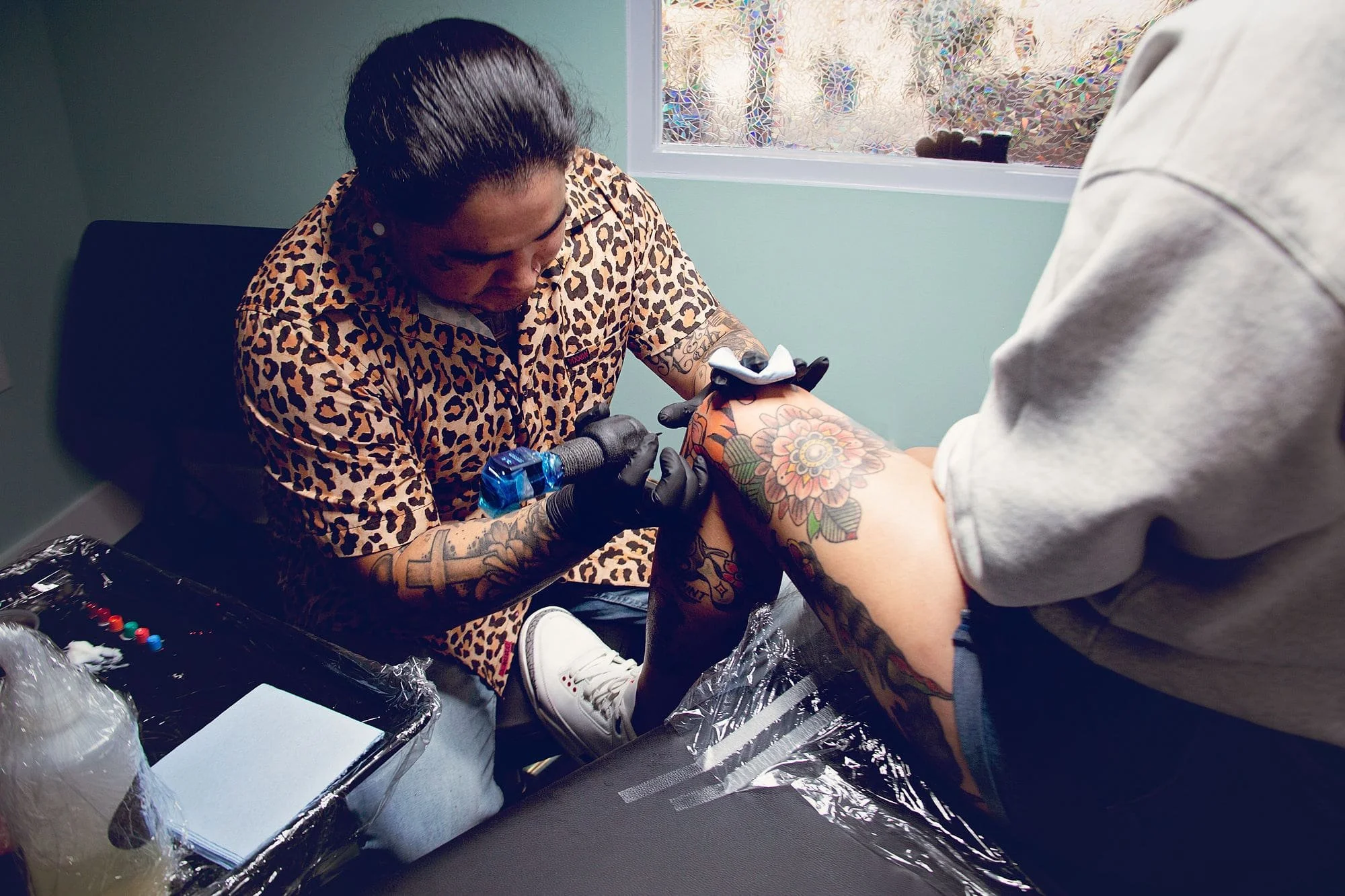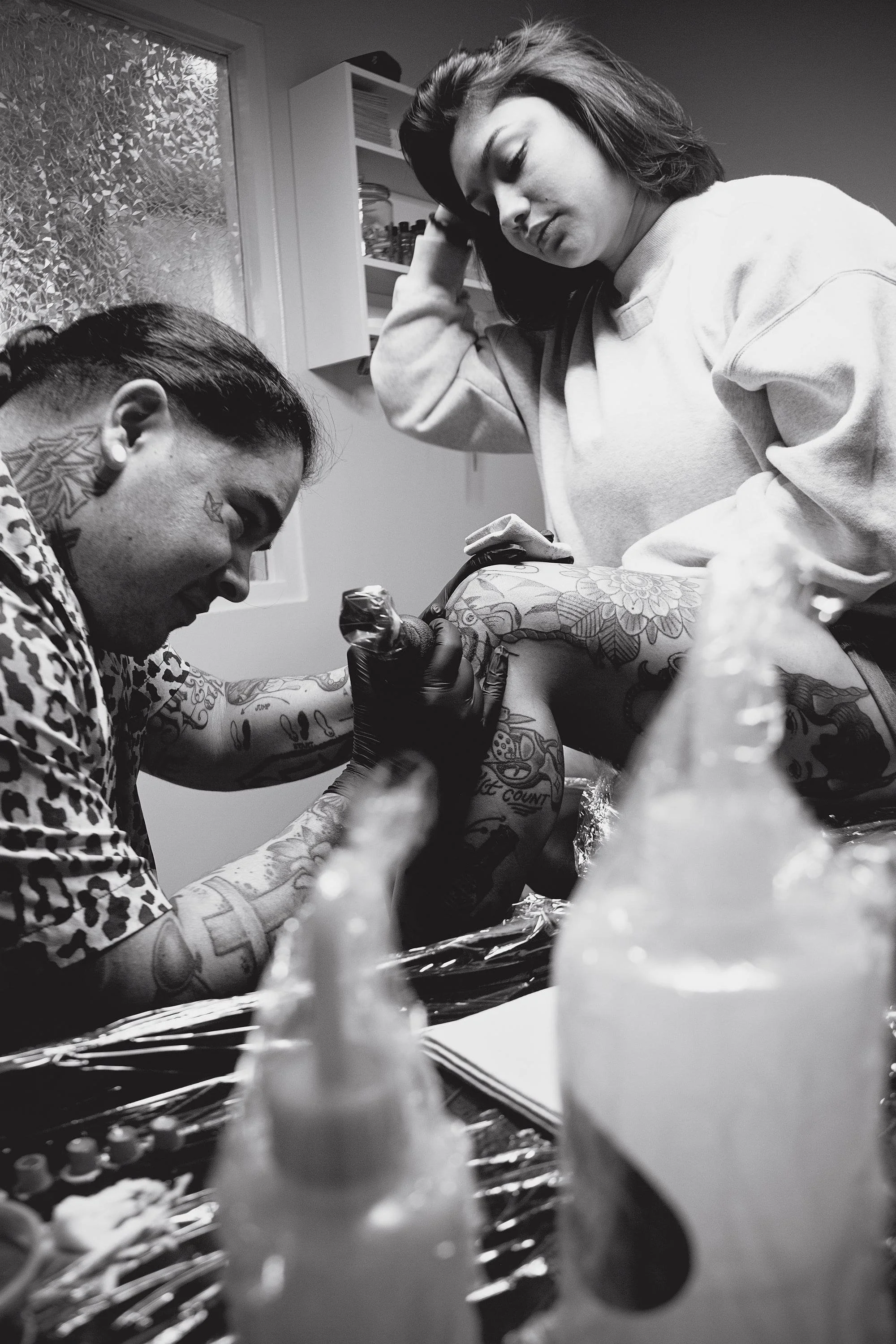 I was born and raised in northeastern Oklahoma with my large, in size and quantity, family. My culture is very important to me being Mexican and Native American was a huge part of my upbringing. We only sleep in teepees on the weekends. The Navy took me to the east coast where I’ve stayed since. I was an A-Ganger on submarines where I weaved the sweet blanket of freedom that covers the country every night for eight years. When I got out in 2019 I turned my sights art-ward and with the unwavering support of my wife, who didn’t help me write this at all, have been tattooing since. I can’t wait to meet you all! Even if you don’t get tattooed, feel free to stop in and say hello.